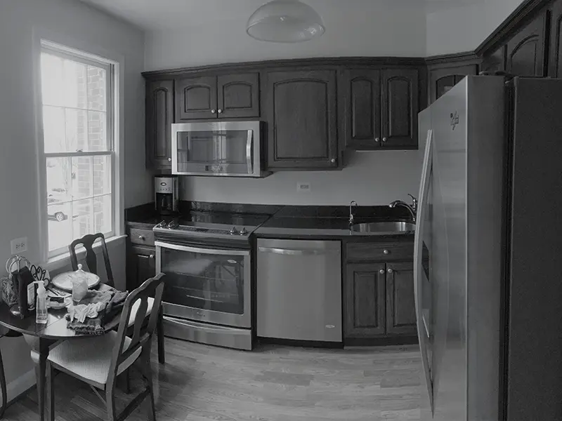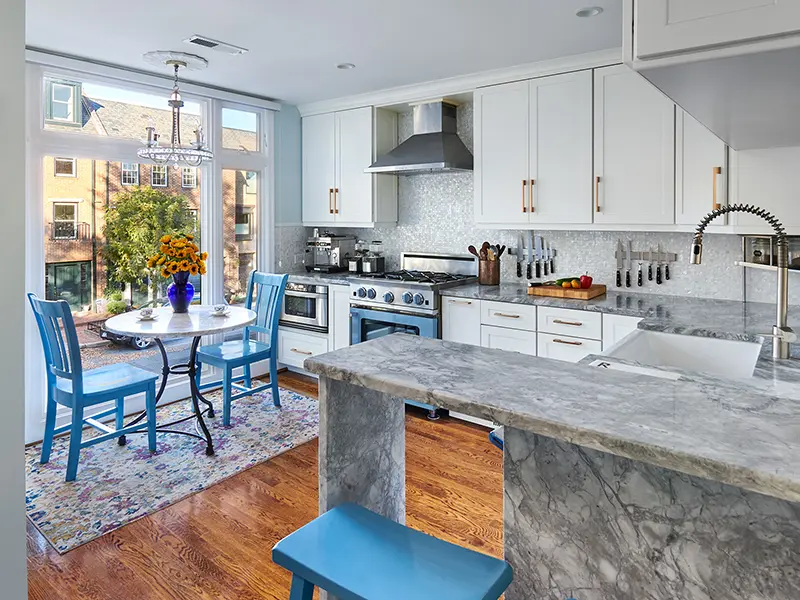 The solution, utilize the concrete balcony for a light-weight copper clad structure allowing the kitchen to expand out on to the balcony’s surface recalling a typical bay window but using modern vocabulary. The large picture window in the kitchen and the glass front cabinetry between the kitchen and dining room where a wall was removed allows greater natural light to penetrate into the depths of the interior dining room space beyond. The small aperture adjacent to the picture window conceals an existing powder room that was to remain in place. The top surface of the bay provided the opportunity for a new balcony off the second-story bedroom.