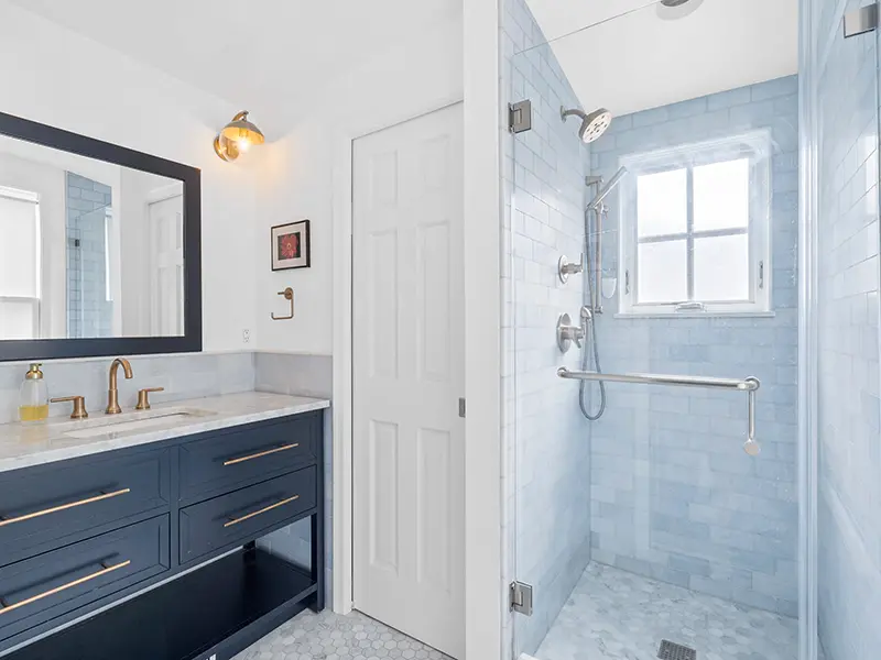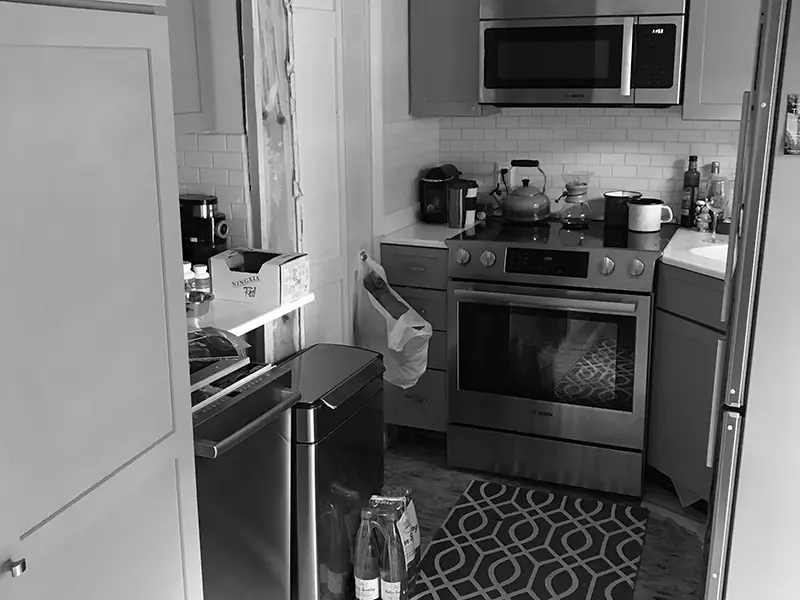 The design replaced the tiny galley kitchen with substandard sized appliances with a spacious new space for cooking and entertaining. The oddly configured second floor with a rear bath that required walking through one bedroom to get to it was eliminated and, in its place, we added two new central bathrooms creating both a true en-suite primary bedroom on the front of the house and a cheerful and light-filled guest suite in the rear.